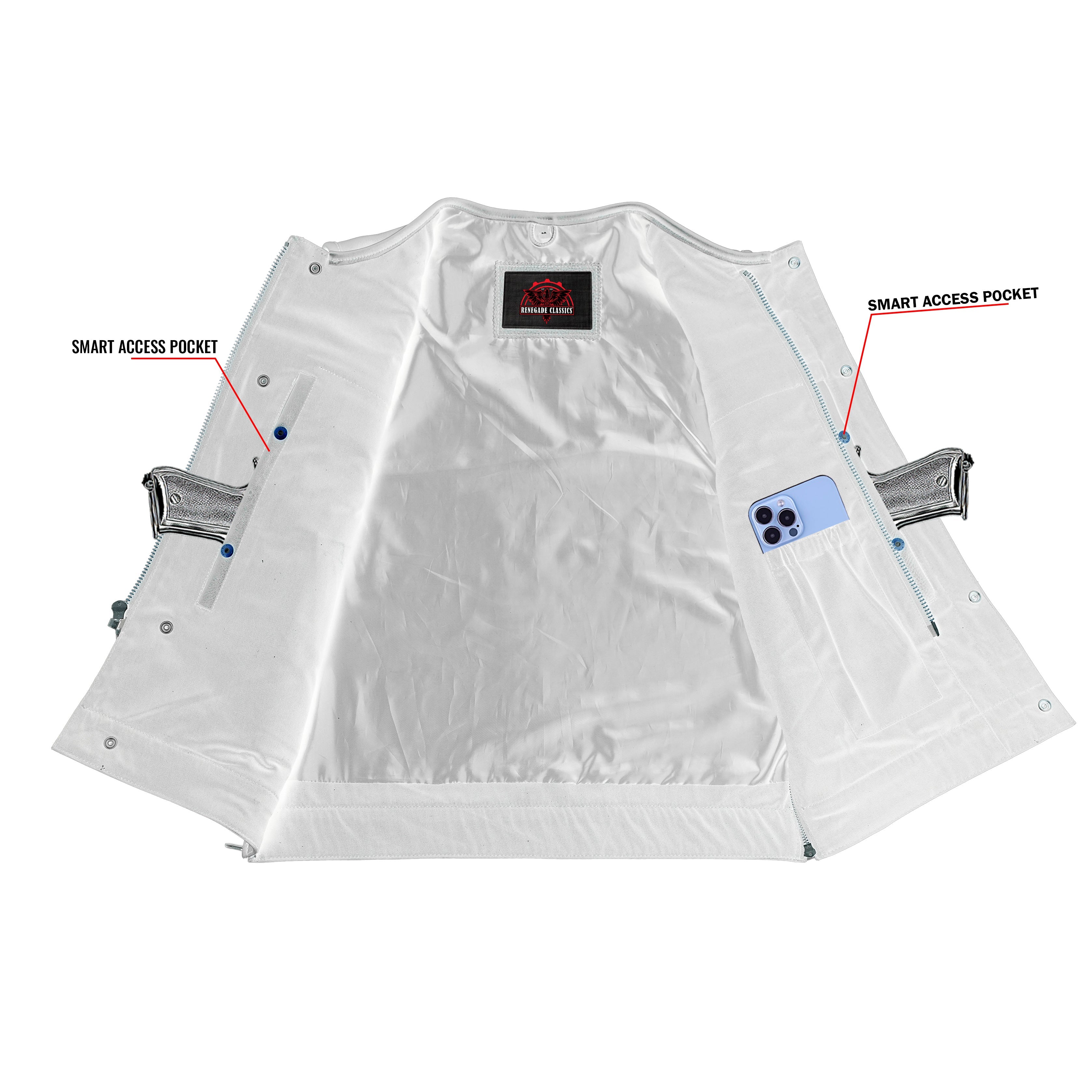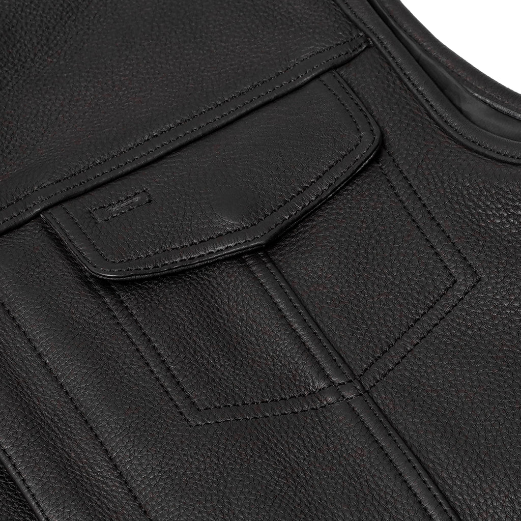 Leather vests offer mobility and security for those who carry guns on the road. Our men's gun pocket vest with bottom side zippers is perfect for bikers who want to conceal carry on or off their bike. Our vests are made of soft, premium drum-dyed milled naked cowhide 1.2 - 1.3mm for comfort and durability.
