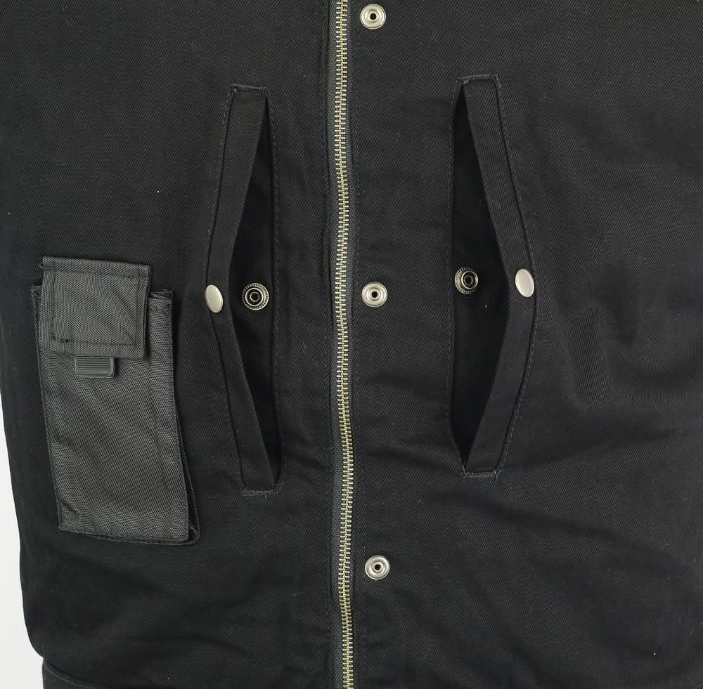 The black metal zipper hides under a snap placket for weather protection and clean lines. With a removable hood, blacked-out hardware, and reinforced shoulders, this vest rides low-key but stays high-alert.