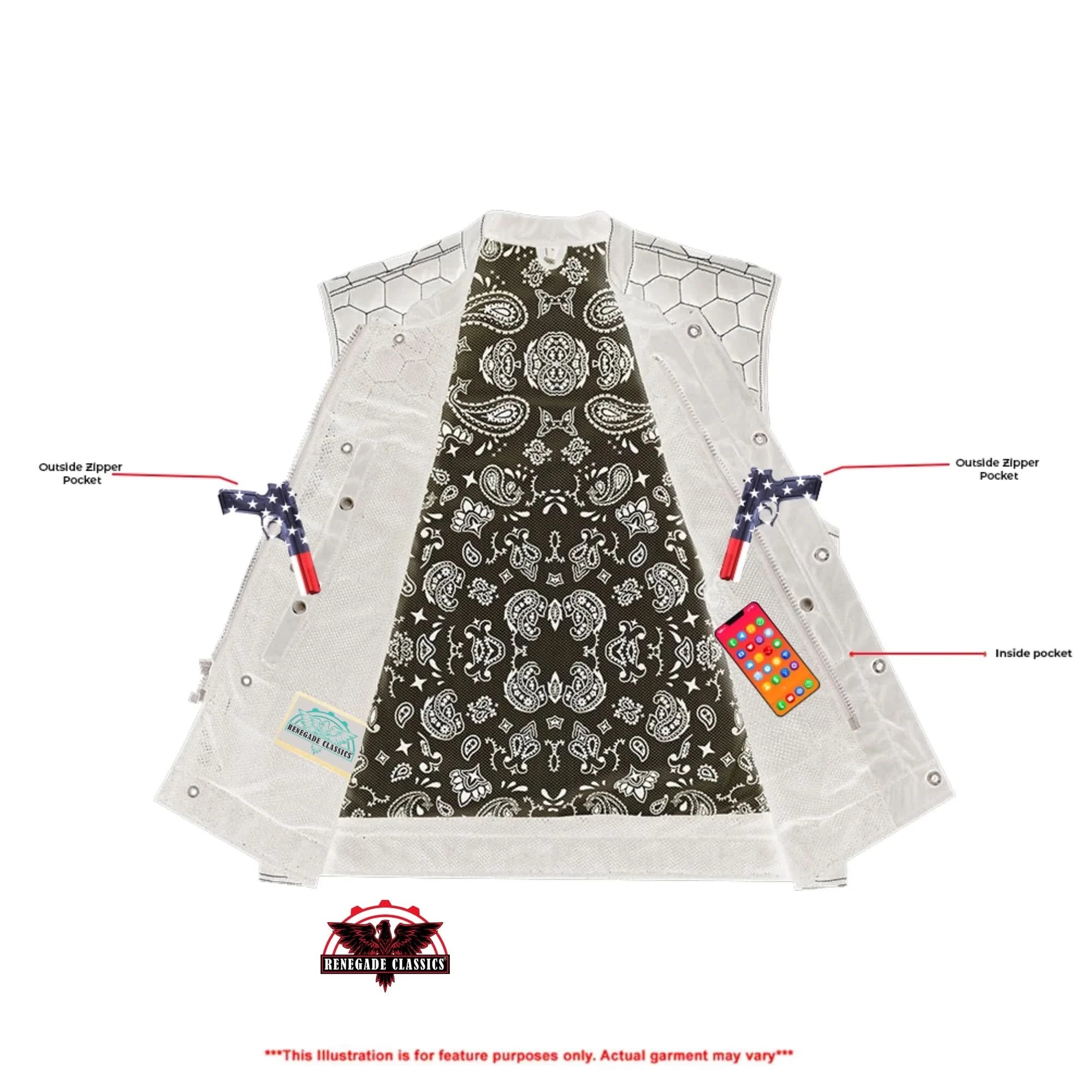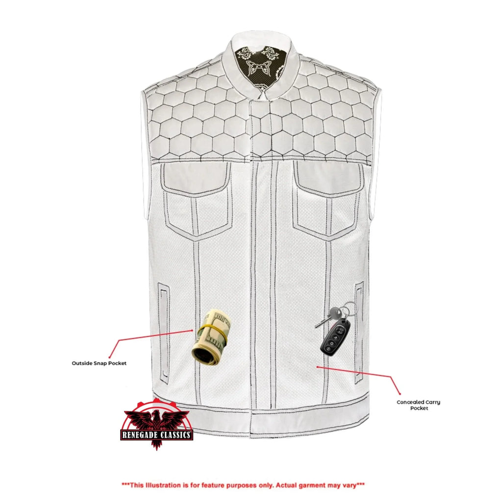 Our Mesh Rave Black Textile Vest features a durable mesh construction with vibrant black accents. It includes concealed carry and secure chest pockets with snap button closures for convenience. The hidden front zipper with snap-placket reinforced stitching and built-in hanging loop adds to its practicality and style. This vest is perfect for those who want a striking, functional Vest to match their riding styles.
